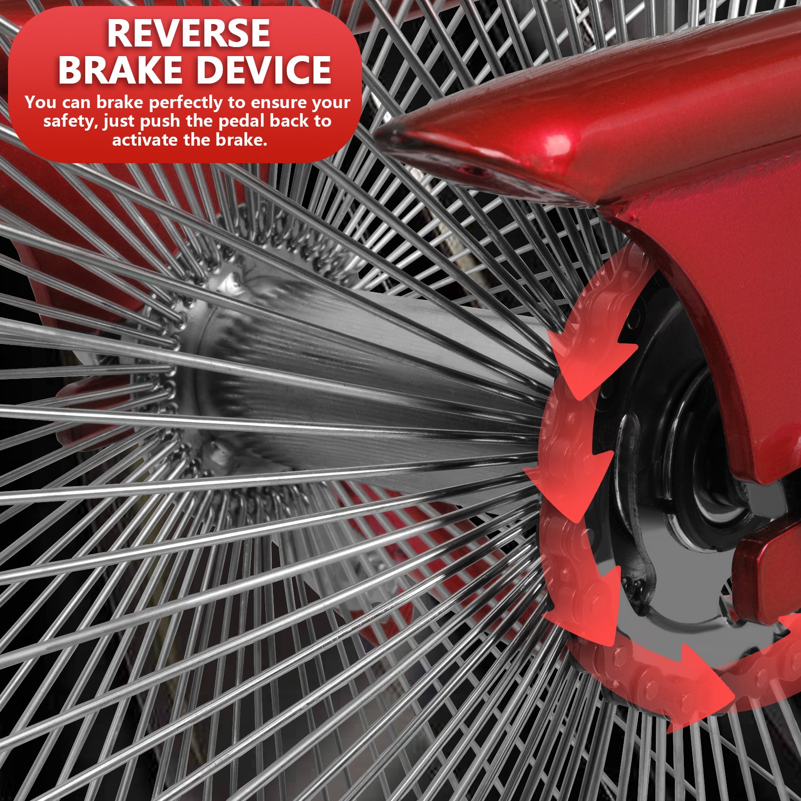 Equipped with a dependable PS75A coaster brake at the front, the bike ensures smooth and efficient stopping power, enhancing safety during your rides. The 80mm front wheel contributes to stability and control, allowing you to confidently navigate various terrains with ease.