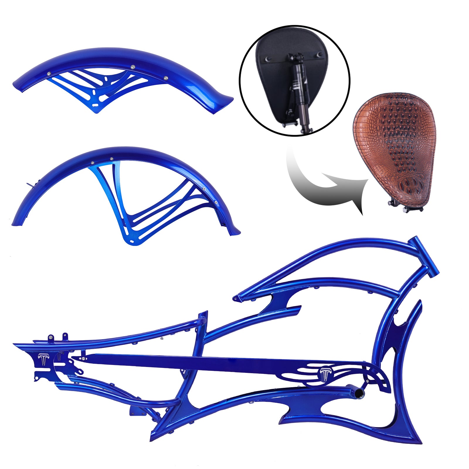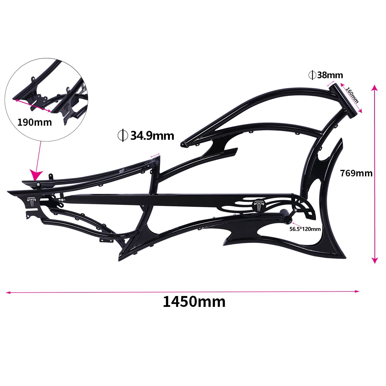 Tracer FM-RAIDER-7  26" Stretch Cruiser Bikes Steel Frame, Includes Chain Guard and Fender, Saddles,Suspension Shock, For 26"x3.0, 4.0 Tire, Rear Hub Spacing 190mm, Bottom Brackets: 56.5mm50mmx120mm. Head Tube: 38mmx34mmx160mm
