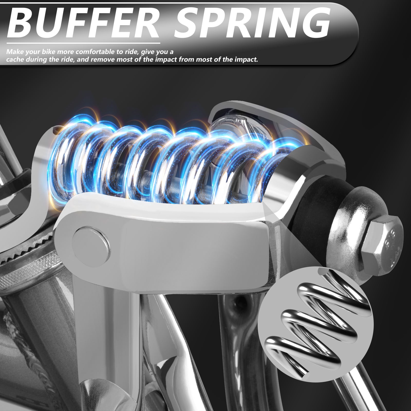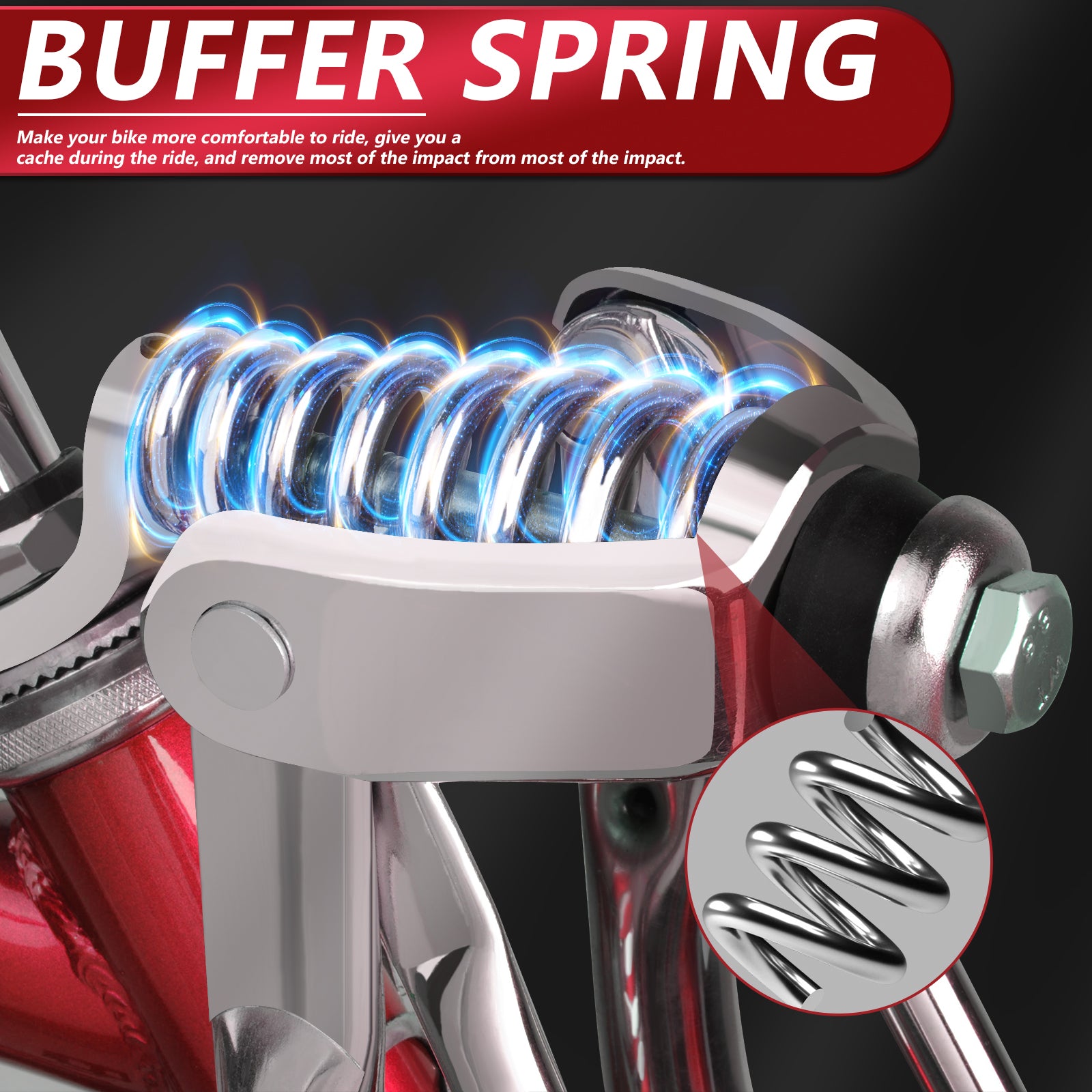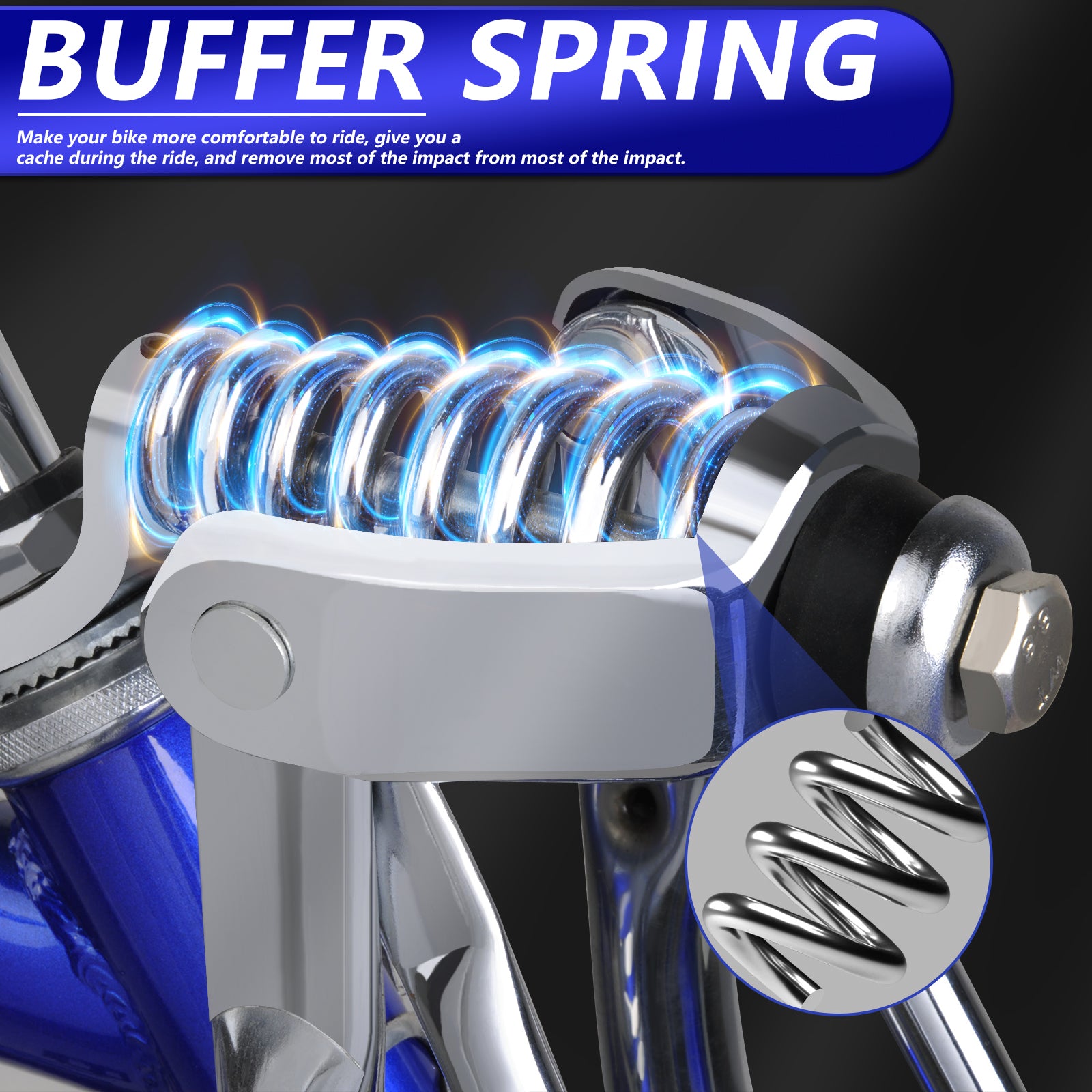 The bike's front end is adorned with a Springer Fork made from Hi-Ten Steel with a sleek Chrome finish, combining style with functionality for improved shock absorption during your rides.