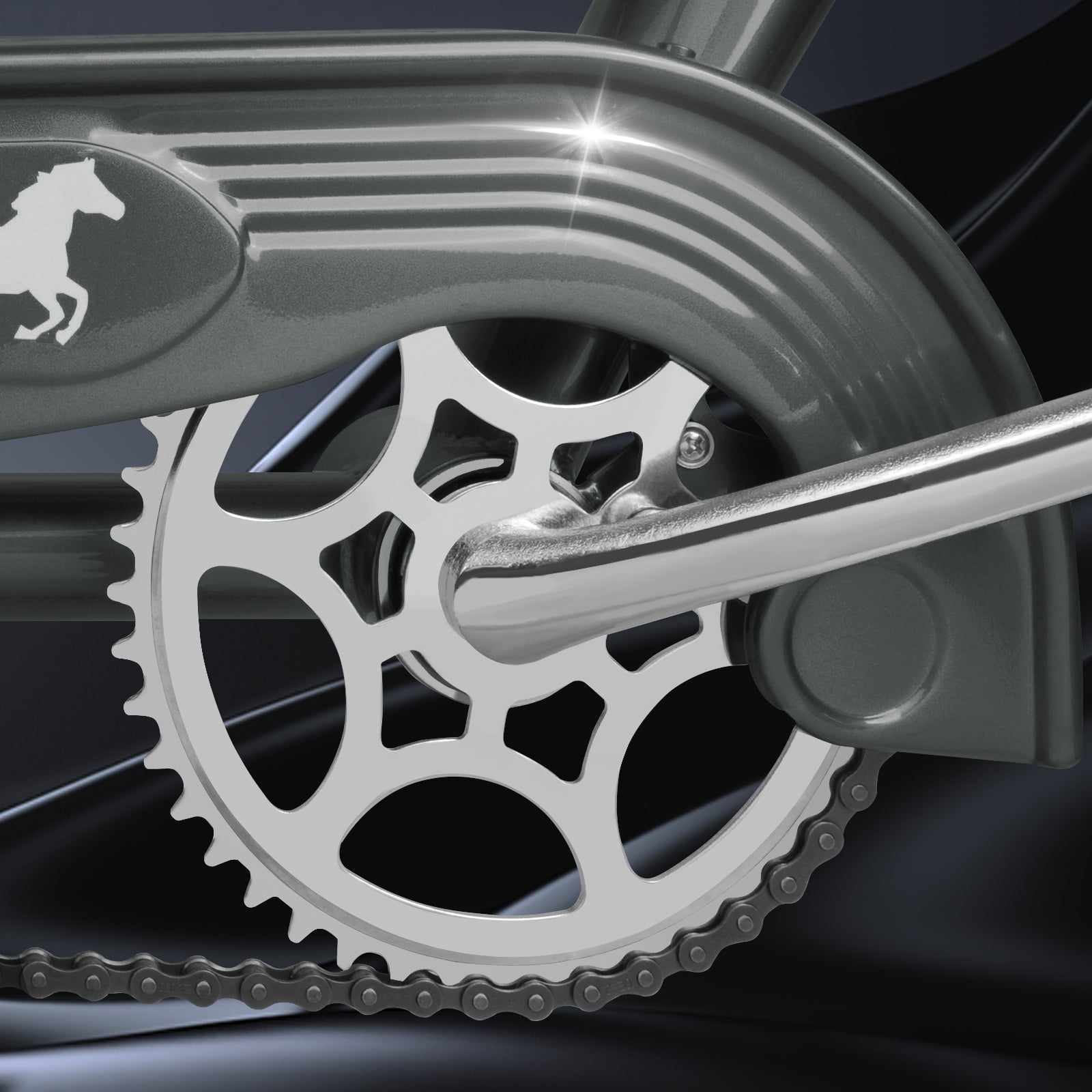 Powering the Mustang GTS is a reliable One Piece Steel Chrome Crankset with 44T Chainrings, providing ample pedaling power for smooth acceleration and easy cruising. The 18T Sprocket Freewheel complements the crankset, allowing for seamless coasting when desired.