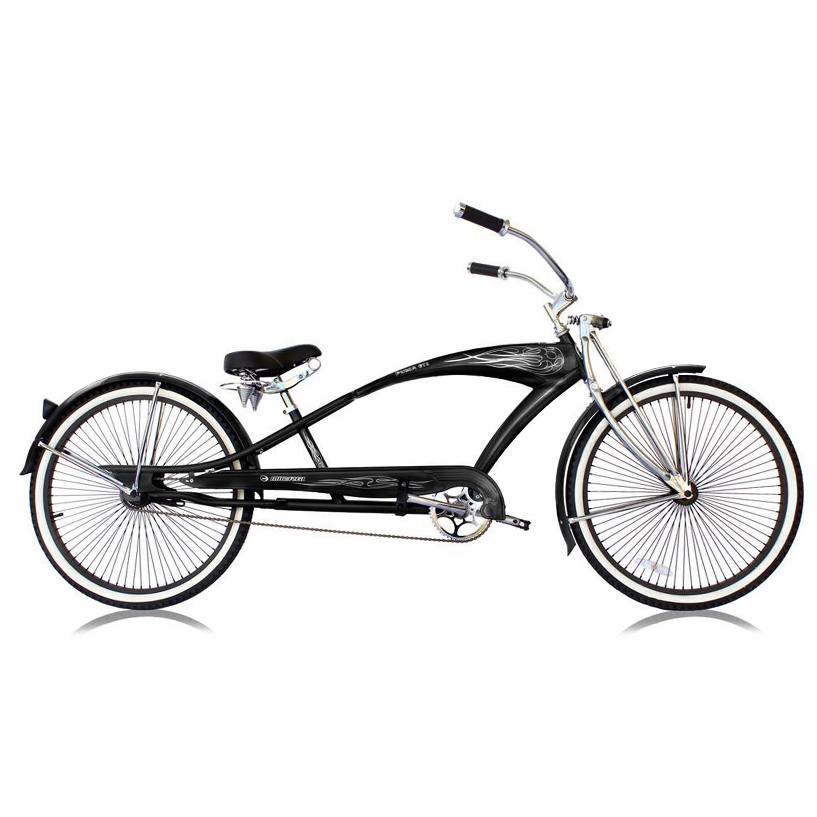 The Micargi Puma GTS is a popular model within the stretch cruiser category. This monster of a bike features a springer end fork, springer saddles, and 68 spoke count rims. The aggressive decals on this bike will appeal to any rider looking to really make a statement while riding (see note below). This stretch cruiser is a single-speed coaster brake which means pedaling backwards to come to a stop. With no brake cables hanging down the moon-shaped handlebars, it does not take away the mean, aggressive look this bike brings. The foam grips make it nice and comfortable to grip while coasting along the beach or the streets.