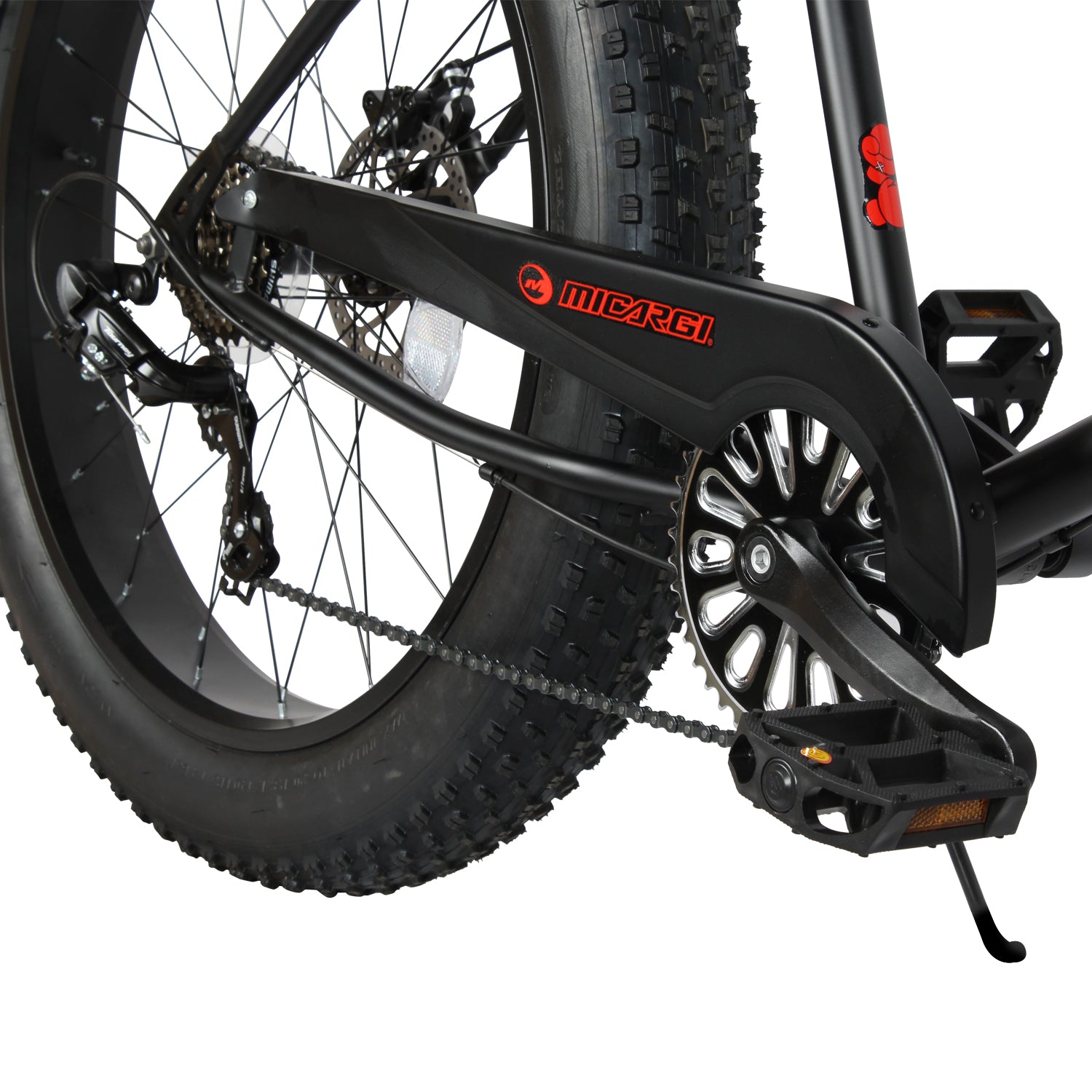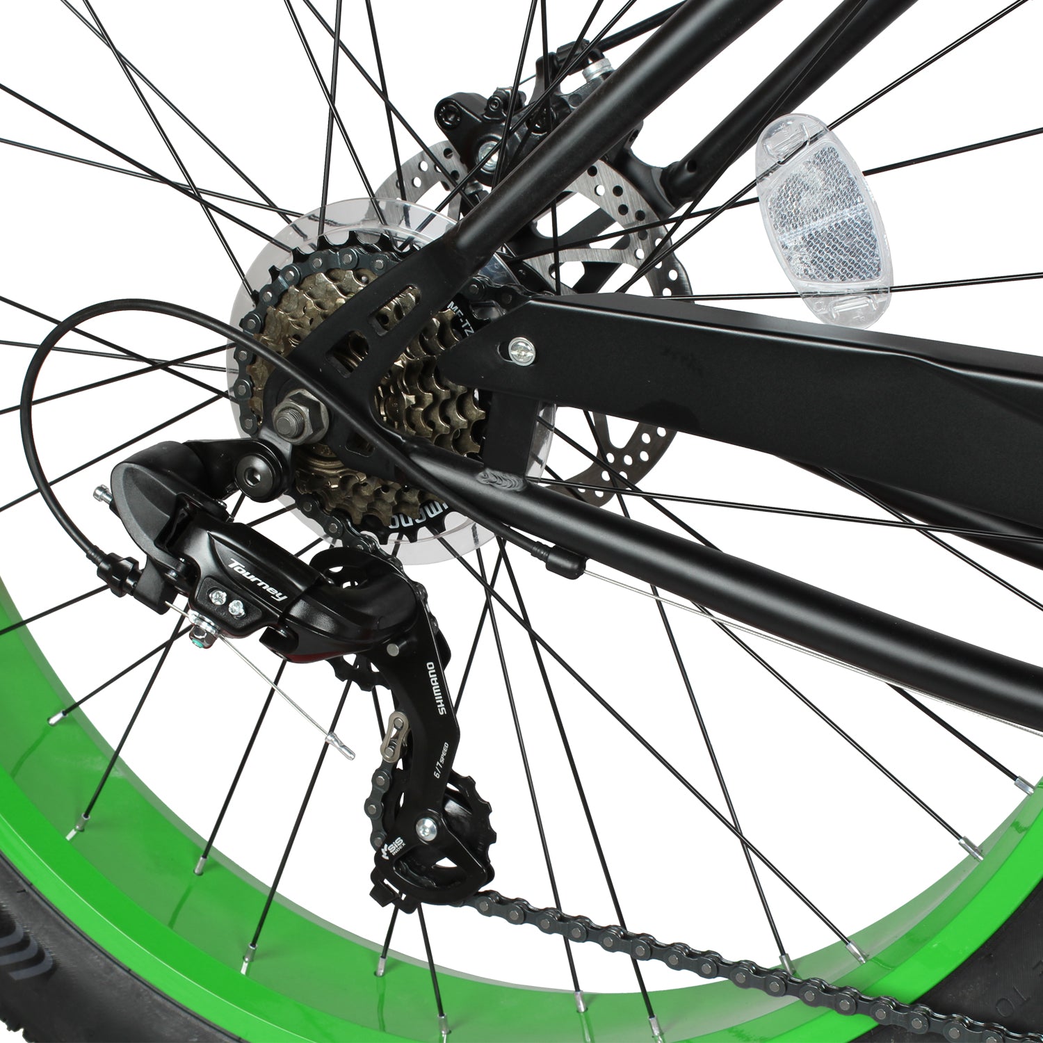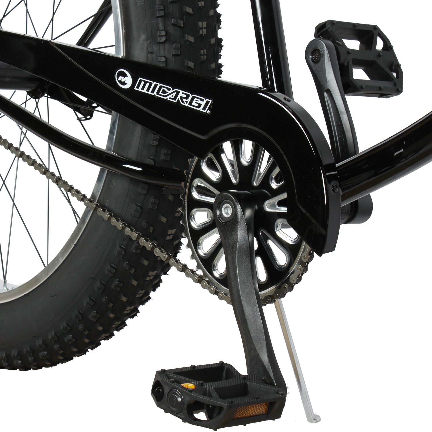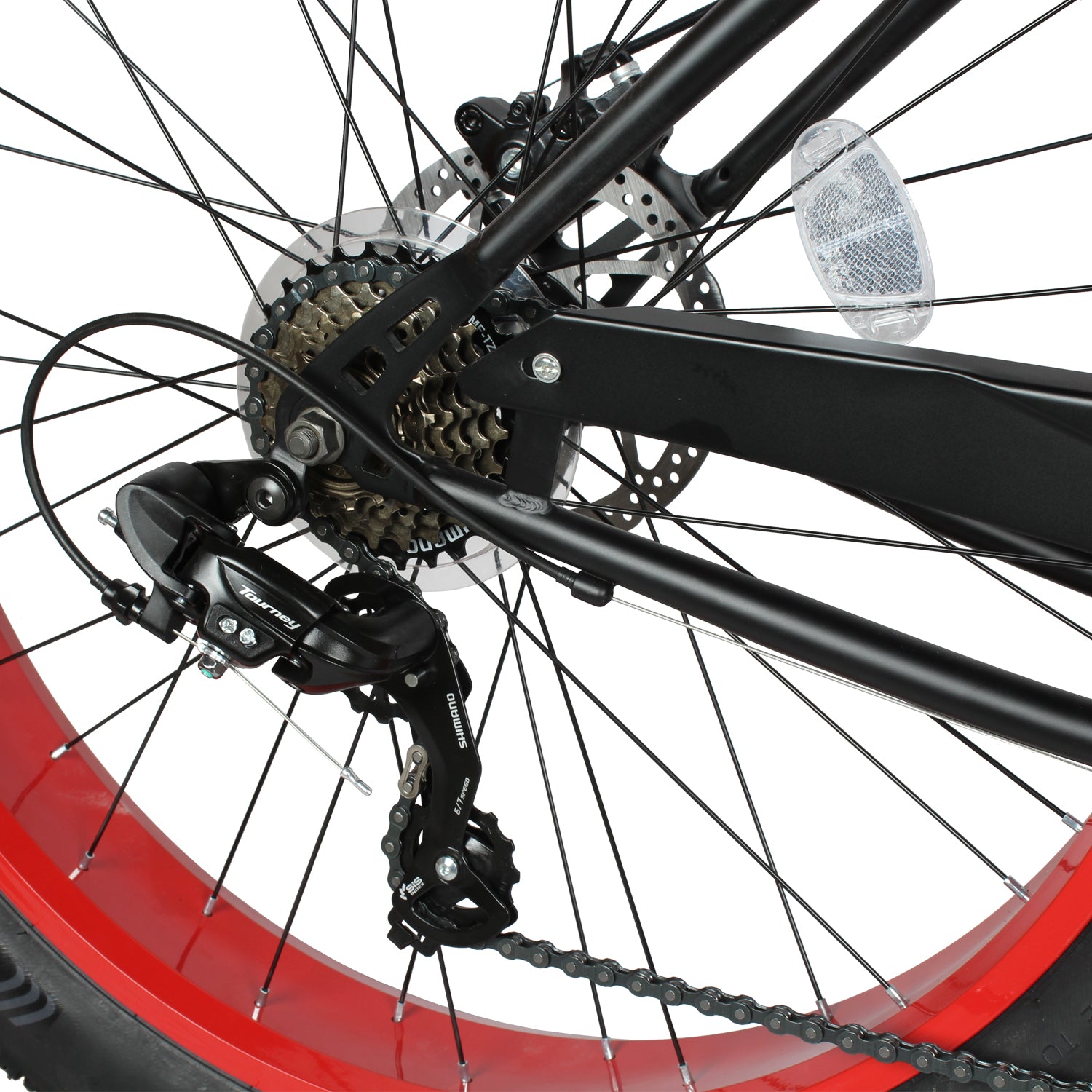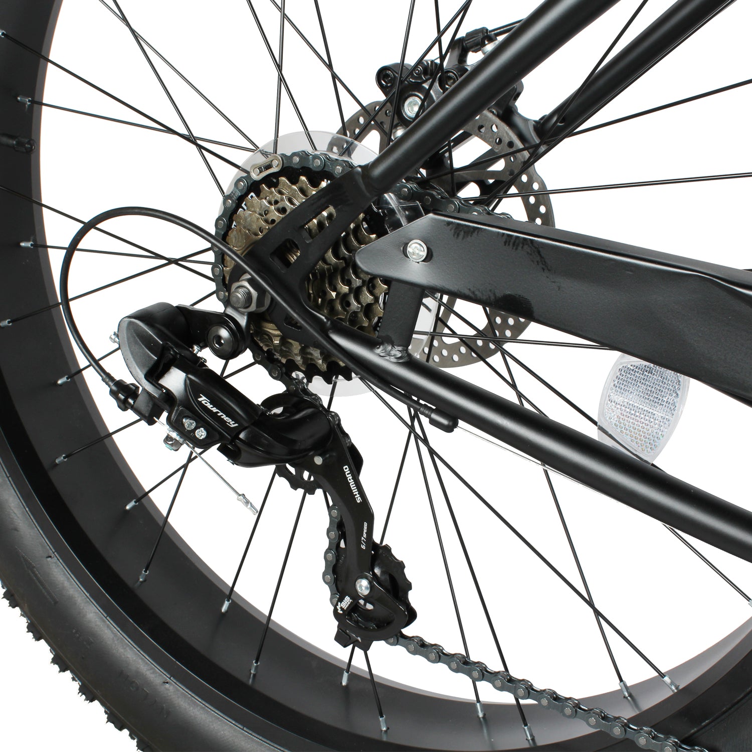 26*4.0 FAT Tire:ompared with ordinary tires, the three-piece alloy crank and wide FAT tire have a larger airbag volume, which can provide better cushioning effect, reduce the feeling of road vibration when riding, and improve riding comfort. Especially on uneven roads or bumpy mountain riding, fat tires can better absorb the impact, and when passing through some complex road conditions, such as sandy beaches, muddy fields, snow fields, etc., they have better passing performance. The low pressure of the fat tire allows the tire to step on soft soil or loose ground better, increasing traction and reducing slippage. The width and low pressure of the fat tires allow the bike to have a lower center of gravity, increasing the stability of the bike and reducing the risk of rolls and crashes.