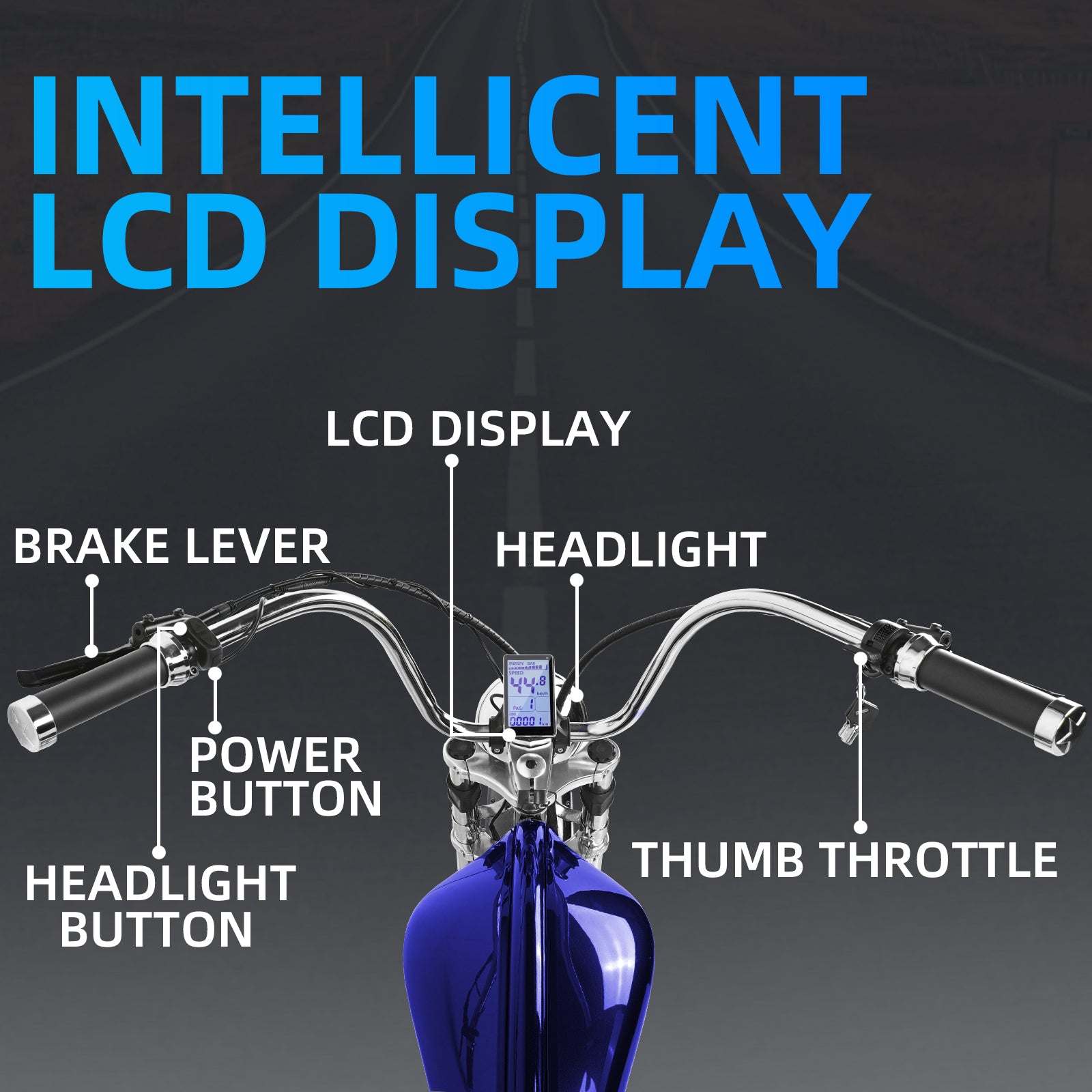 | EXTRAS | This Lithium Battery 26 Inch Electric Stretch Chopper Bike is powered by 48V/17.5Ah Li-ion battery which can be charged in 4-6 hours. It is constructed with Alloy/Hi-ten steel. Equipped with 500W light weight high speed brushless rear wheel hub motor (EU), it can achieve a maximum speed of 25mile/h with a travel range of 30-50mile. It has an intelligent Pedals Assisted System 3 riding modes and 5 levels of pedal assist, which makes it like a normal bike and provides a natural riding experience, right at your fingertips. Toggle between three levels of assist with easy-to-use on-bar controls. will be a better choice for long time travel and exercise. |
