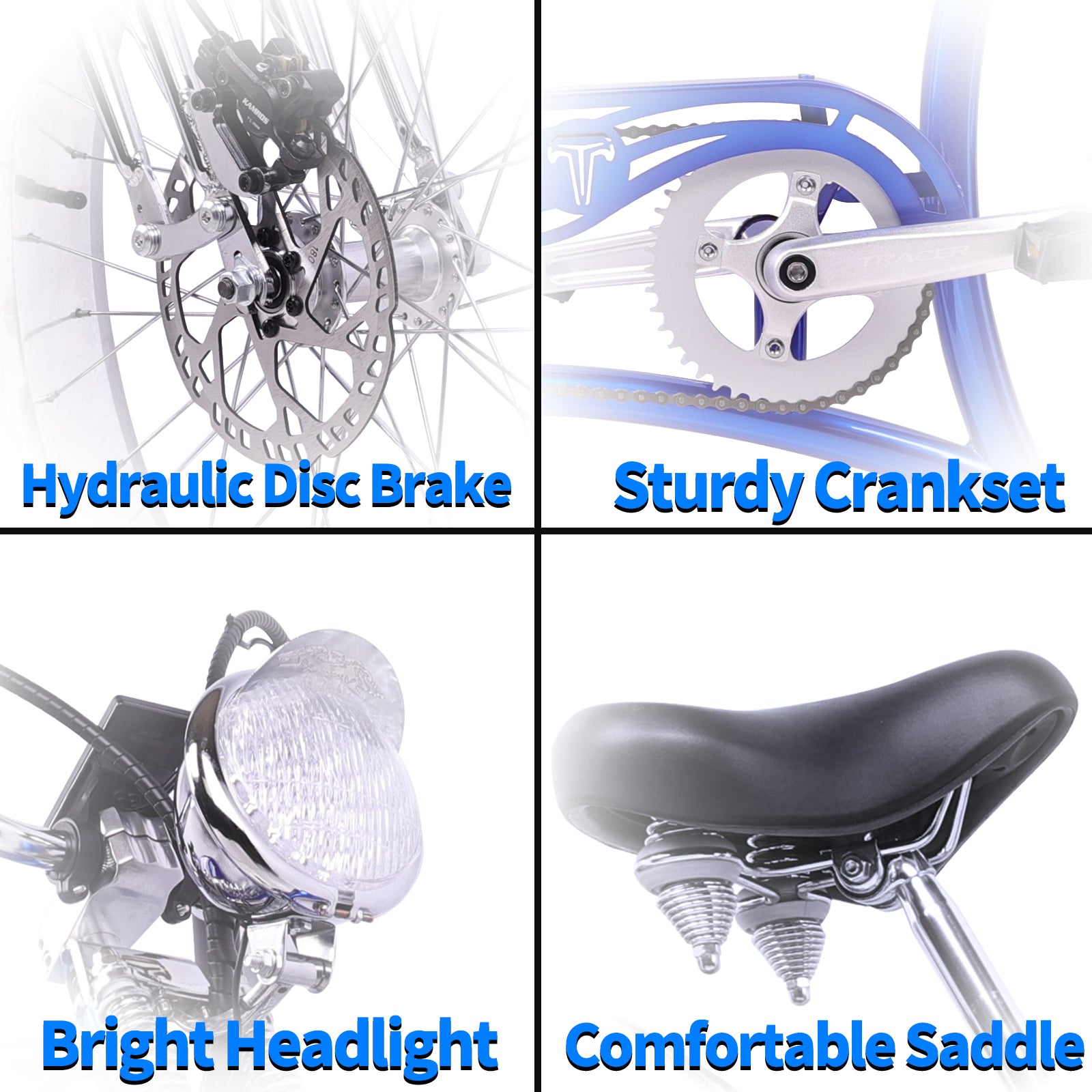 Tracer Twenty5 GT 26" Electric Cruiser Bike in style with the Tracer Twenty5 GT! This 26" chopper stretch cruiser is powered by an 800W motor and features a Samsung 48V/17.5Ah lithium-ion battery, offering smooth rides with a 5-speed motor. Equipped with a steel frame, triple tree fork, hydraulic disc brakes, and FAT white wall tires, it combines durability with retro flair. Enjoy effortless riding with the intelligent pedal assist system, 3 modes, and 5 levels of assistance, perfect for both leisure and long rides.