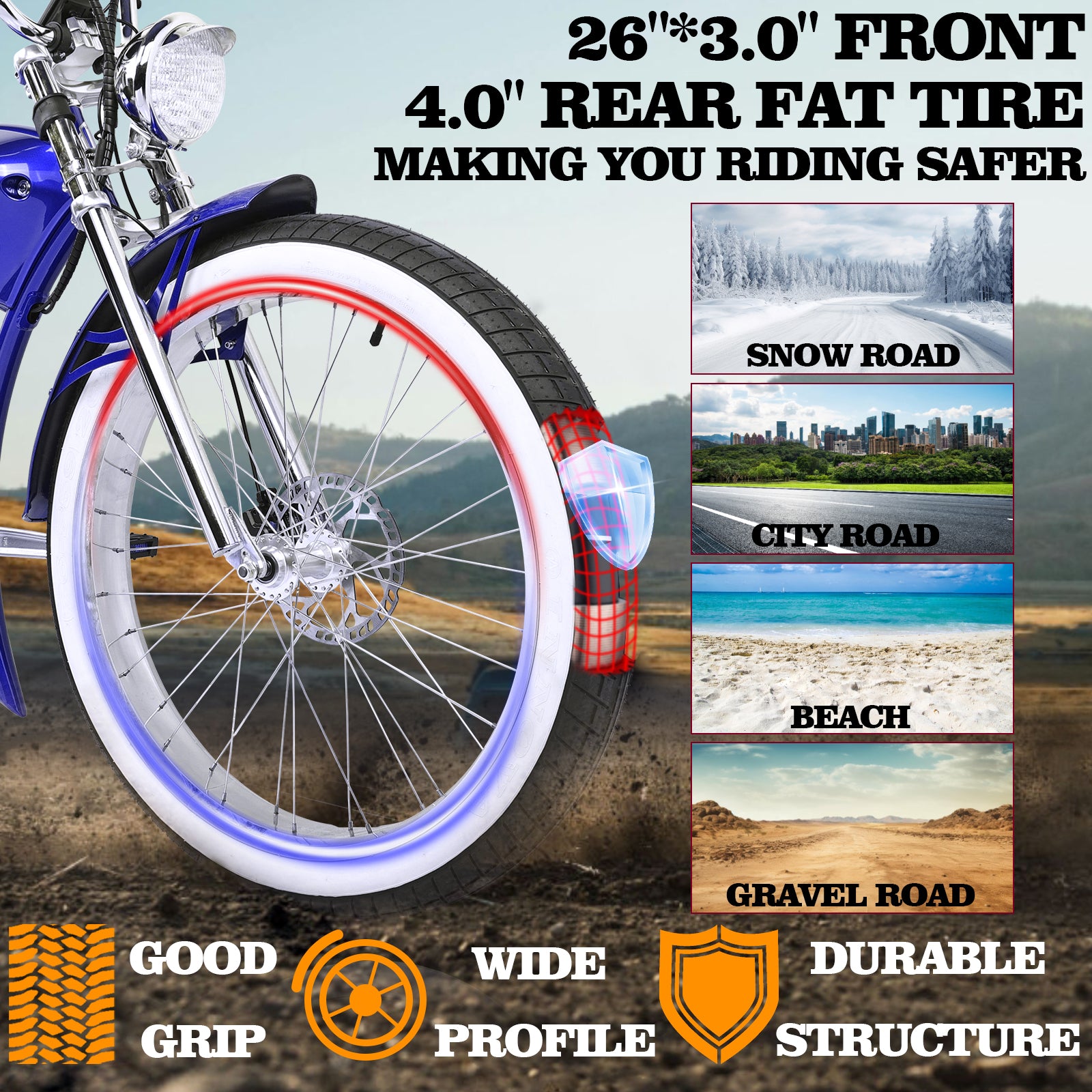 FAT White Wall Tires, 26”x3.0 (Front), 26”x4.0 (Rear) |