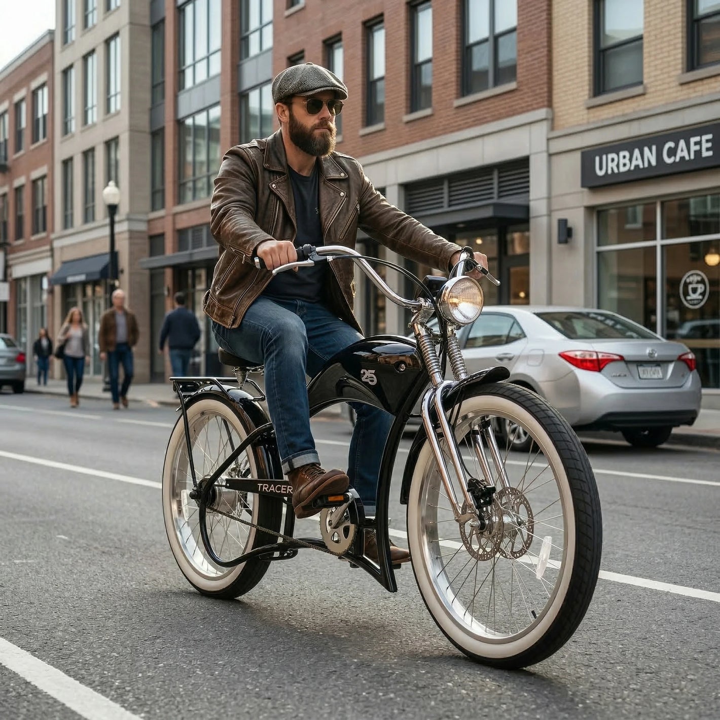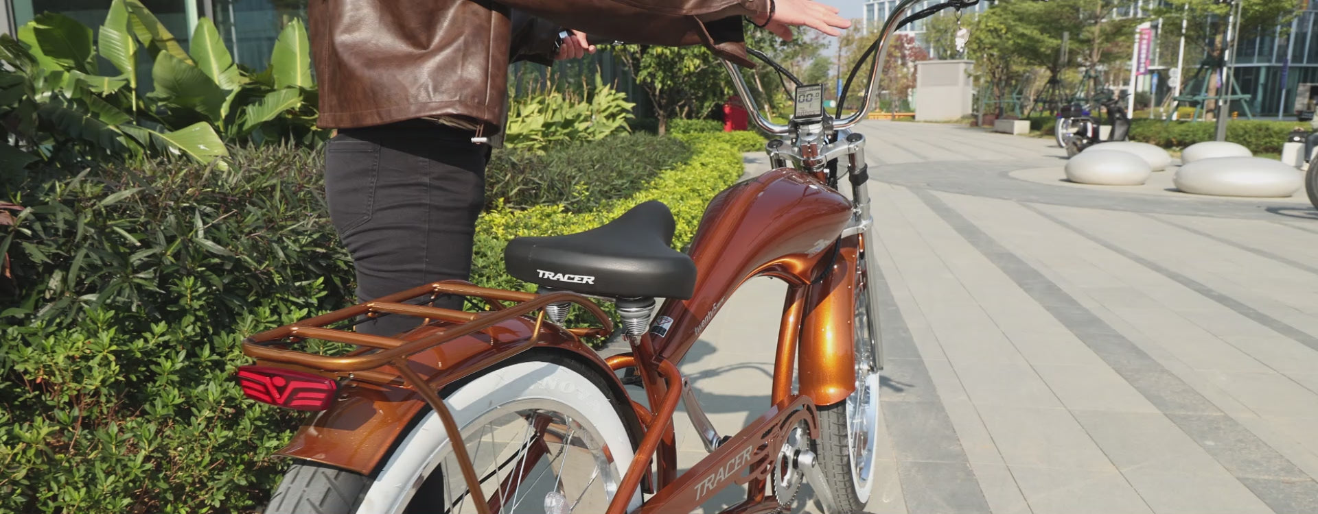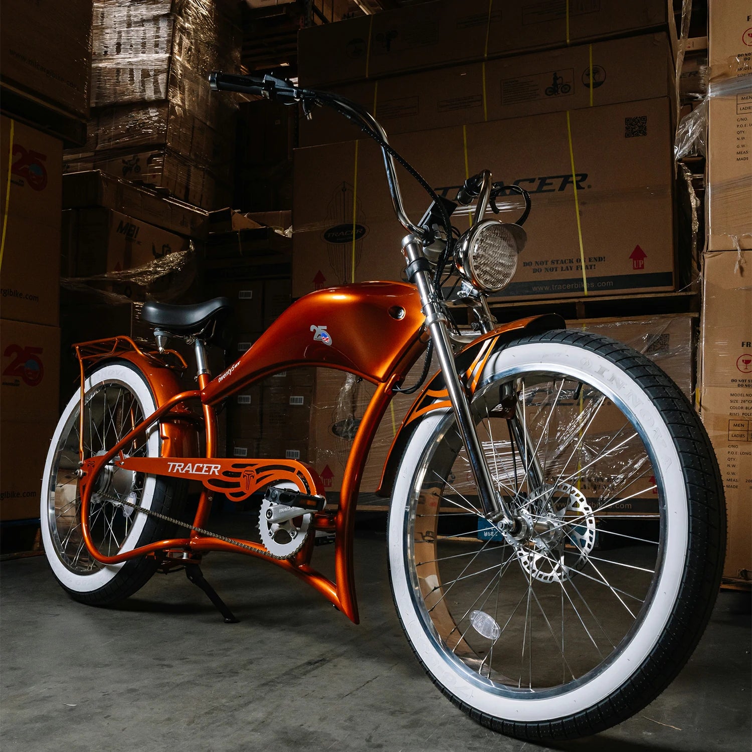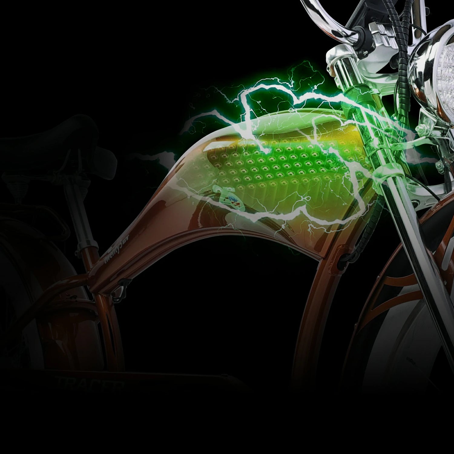 The Tracer Twenty5 is a 26" chopper stretch cruiser that reimagines electric biking—blending vintage motorcycle style with modern performance. Its elongated frame, FAT white wall tires, and bold silhouette make it a head-turner, while an 800W motor and Samsung 48V/17.5Ah battery deliver reliable power and range.