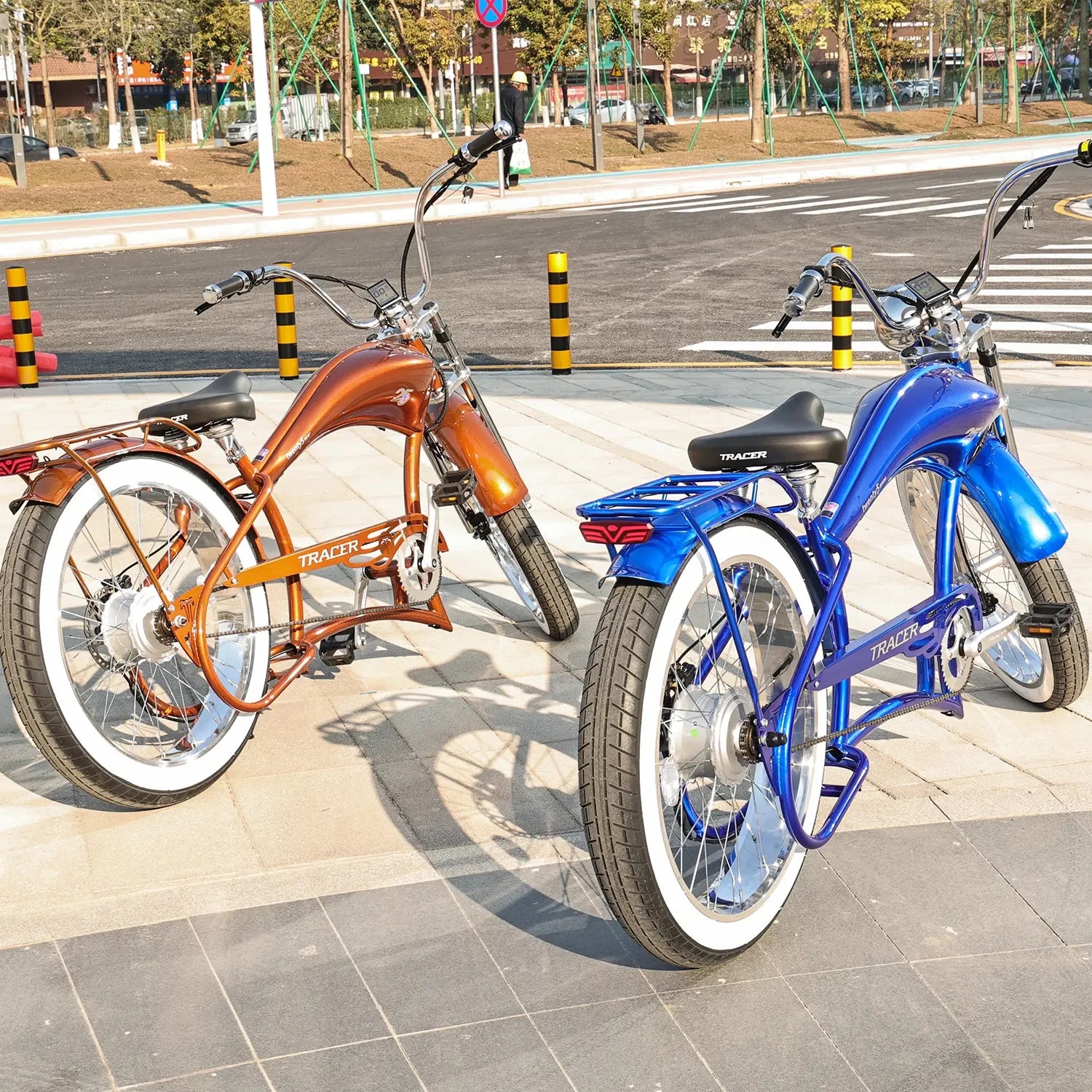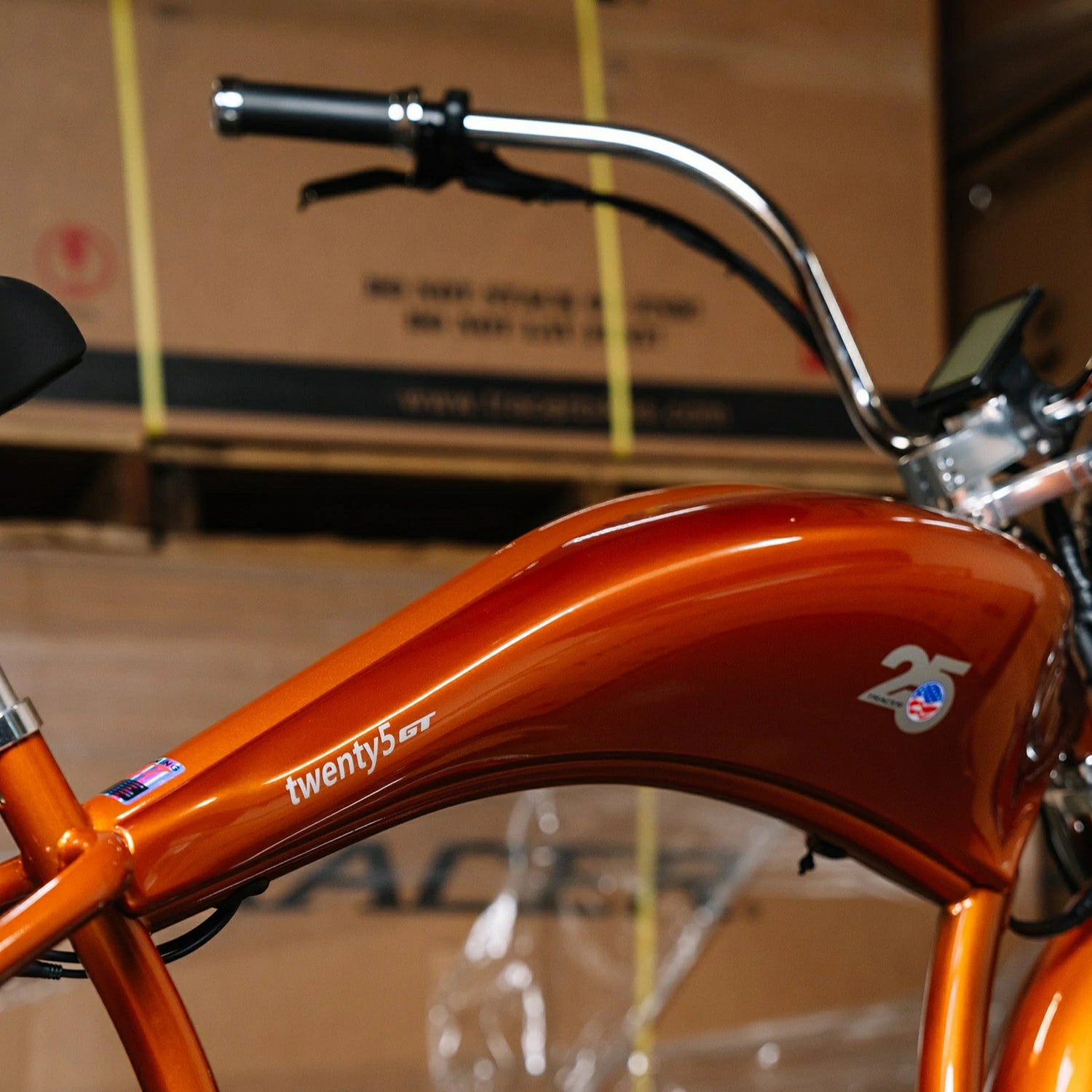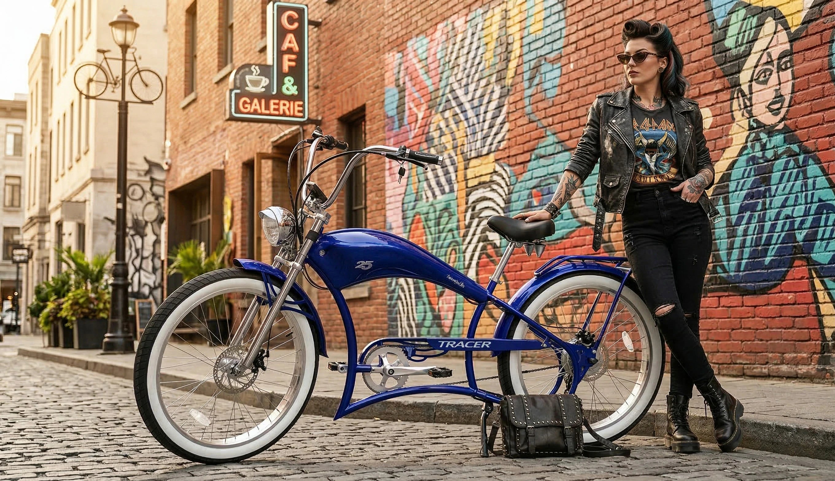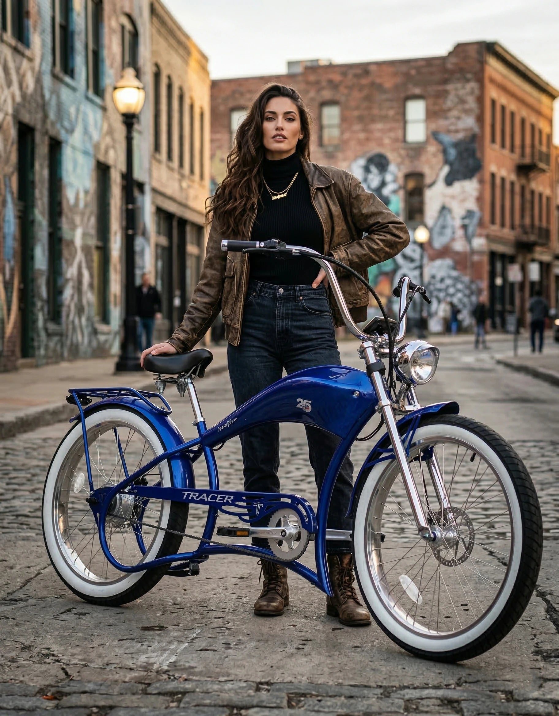 The Tracer Twenty5 is a 26" chopper stretch cruiser that reimagines electric biking—blending vintage motorcycle style with modern performance. Its elongated frame, FAT white wall tires, and bold silhouette make it a head-turner, while an 800W motor and Samsung 48V/17.5Ah battery deliver reliable power and range.