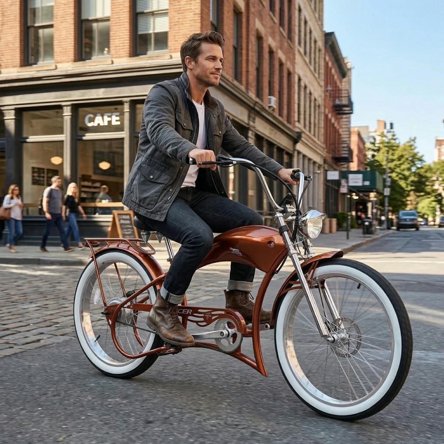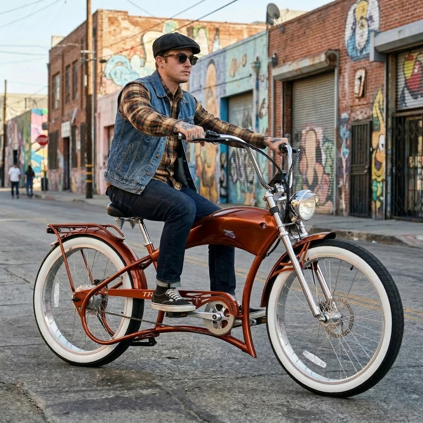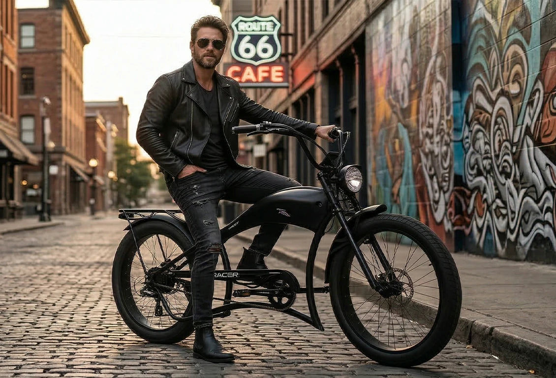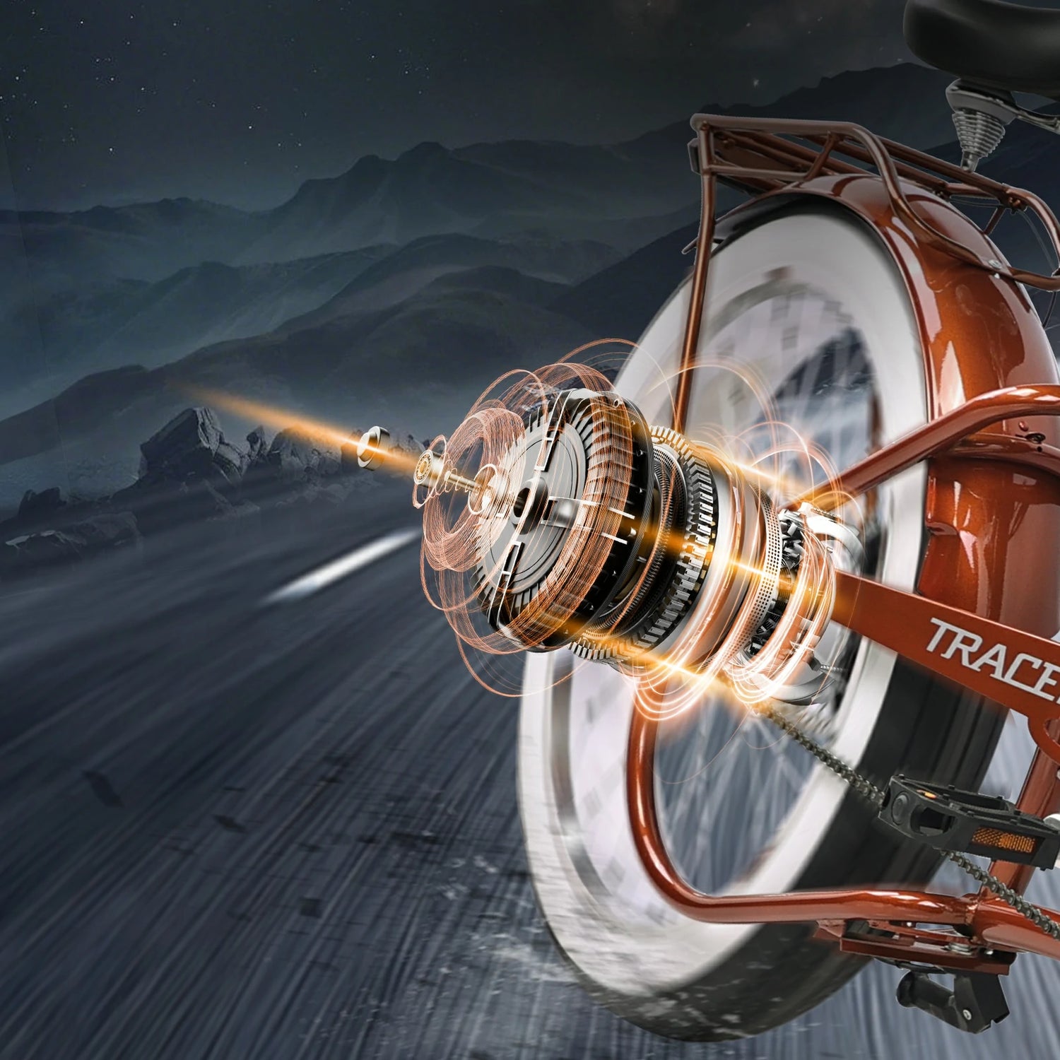 The Tracer Twenty5 is a 26" chopper stretch cruiser that reimagines electric biking—blending vintage motorcycle style with modern performance. Its elongated frame, FAT white wall tires, and bold silhouette make it a head-turner, while an 800W motor and Samsung 48V/17.5Ah battery deliver reliable power and range.